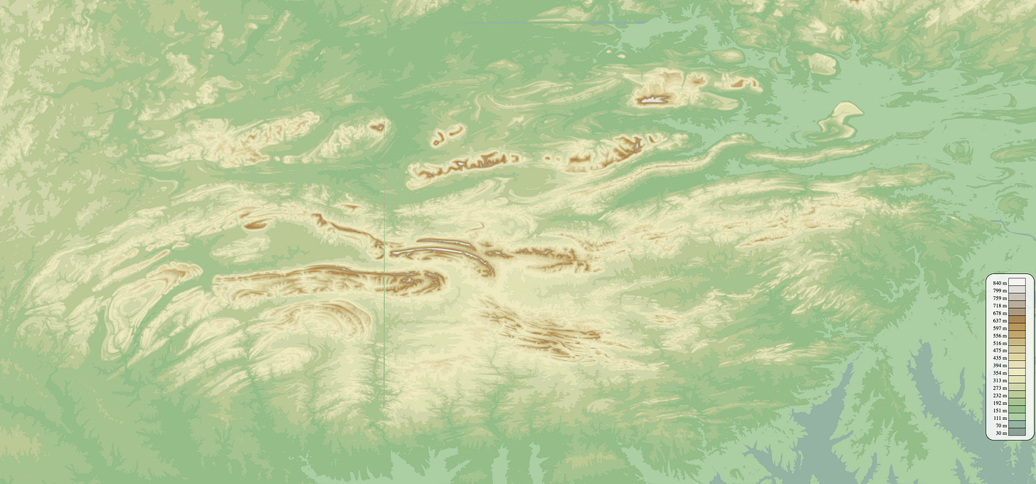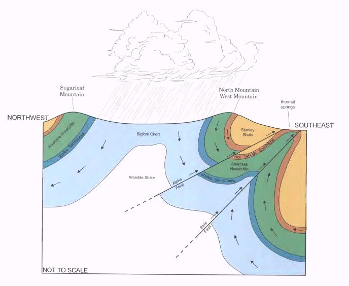 Okay, stick with me on this because I am a climate scientist whose geology background is largely focused on the coast (and always tied to the climate). The Ouachita Mountains consist of a series of Paleozoic Era strata (538.8–251.9 Ma) that were deformed during the Ouachita orogeny, a mountain-building event that began during the Pennsylvanian Subperiod (323.4–298.9 Ma). (The intervals captured in these stratigraphic sequences range from the Cambrian Period (538.8–486.9 Ma) to the Pennsylvanian Subperiod.) This was the result of the South American plate subducting beneath the North American plate. Normally, there are mountains and volcanoes relatively close to the subduction zone, as we see along the west coast of South America. However, that was not the case here. Instead, these mountains did not experience much volcanism or metamorphism, which is unique. Additionally, the east-west orientation of the mountains is uncommon in the US.